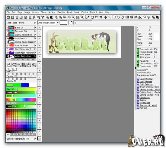 TwistedBrush Open Studio - графический редактор с рядом уникальных инструментов. Разработчики уверяют, что таких кистей больше нет ни у кого. Кроме того вы найдете слои, маски, фильтры и все прочие атрибуты профессионального графического редактора.