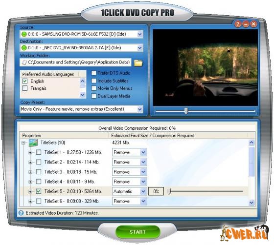 1Click DVD Copy - простой и быстрый инструмент для копирования видео DVD. Подойдёт как начинающим пользователям, (так как очень прост), так и продвинутым... Важно не то, что она обладает простым, но эргономичным интерфейсом и быстро работает, а то, что именно эта программа выдает наилучшее качество изображения при копировании среди себе подобных. Даже при 40% сжатии копия практически неотличима от оригинала.