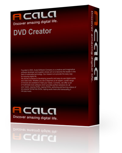 Acala DVD Creator - это простая в использовании, но мощная программа для DVD авторинга. Предназначен для тех, кто хочет наслаждаться просмотром фильмов на DVD-плеере. Вы можете конвертировать видео практически всех форматов, таких как AVI, DivX, XviD, MPEG, Mp4, 3GP, MOV, WMV, ASF, HD видео в DVD D5/D9 фильмы и записывать их на DVD.