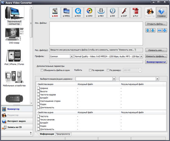 Axara Video Converter - это мощный и многофункциональный видеоконвертер, с помощью которого Вы сможете выполнить практически любые действия с видео: DVD риппинг, конвертировать и редактировать видеофайлы в различные форматы и для различных устройств.С помощью Axara Video Converter можно легко сохранить фильм DVD с диска на ПК, мобильный телефон или любое мультимедийное устройство (iPhone, iPod, PSP, Zune, Creative...) или наоборот, записать видео на DVD диск.И еще одна интересная возможность: благодаря новой технологии 2PassEncoding позволяет сконвертировать DVD-фильм в стандартный XviD MPEG4 без потери качества.