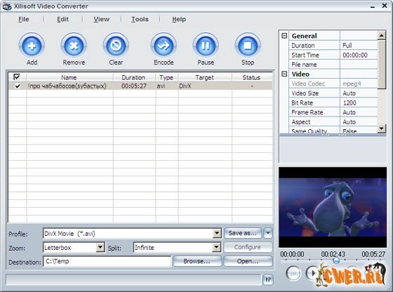 Xilisoft Video Converter - мощный, универсальный видео конвертер. Поддерживает большинство популярных видео форматов, в том числе DVD, VCD, SVCD, MOV, RM, AVI, MPEG, MPEG1, MPEG2, MPEG4, WMV, 3GP, h264 и т.д. Присутствует возможность конвертирования в iPod и PSP видео. Кроме того, Xilisoft Video Converter позволяет с легкостью извлекать аудио из видео с последующим конвертированием в MP2, MP3, AC3, RA, M4A, OGG, AAC и другие форматы.