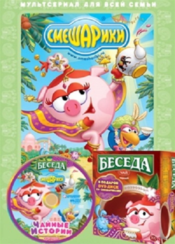 Российский мультипликационный сериал. Смешарики ориентированы на аудиторию любой возрастной группы, в них большое внимание уделено юмору. Мультсериал создан в рамках проекта "Мир без насилия" и производится при поддержке Министерства культуры. Главные герои - круглые зверушки, каждый обладает своим индивидуальным характером, что позволяет детям изучать их. Сюжеты построены на различных ситуациях, воспроизводящих реальные проблемы, с которыми может столкнуться ребёнок в жизни. По мнению авторов, шарообразность персонажей подчёркивают их доброту и позволяет легко их нарисовать даже ребёнку. Диск продаётся в коробке чая "Беседа" как подарок к чаю.