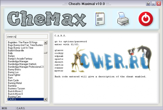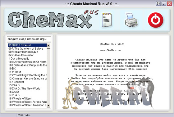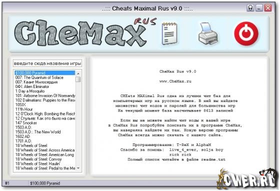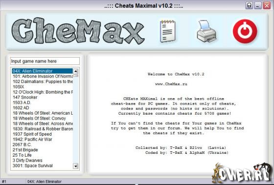 CheMax - наибольшая из известных на данный момент программ, которые являют собой базу данных с кодами для игр. Простой и красивый интерфейс, малый размер, и при этом огромное количество представленных игр. Особенностью базы является отсутствие в ней хинтов и прочей “отсебятины“, вашему вниманию представлены только коды (cheats, hex-cheats) и пароли (passwords).