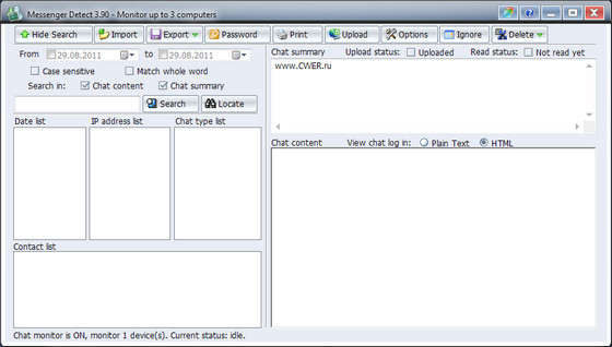 Программа для автоматического обнаружения и записи переговоров, ведущихся в локальной сети на всех компьютерах с помощью интернет-пейджеров ICQ, MSN, AOL (AIM) и Yahoo, причем записываться может весь чат, включая включая цвет и шрифт текста, смайлики и т.п. Имеется опция поиска по записанному логу, при желании он может быть преобразован в формат RFT. Незаменимый инструмент для начальников, желающих узнать, о чем сотрудники общаются в рабочее время по ICQ, а также недоверчивых мужей и заботливых родителей. Программа устанавливается только на один компьютер в сети, после чего собирает информацию об IM-клиентах, установленных на других ПК, и перехватывает все разговоры, которые ведутся с их помощью. По записанным разговорам можно выполнять поиск. Кроме этого, доступна возможность чтения разговоров вслух. Доступ к программе, а также ее настройки защищаются паролем, поэтому отключить ее, не зная пароля, не получится.