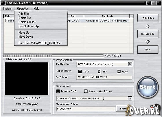 AoA DVD Creator - программа предназначена для создания DVD фильмов из обычных видеофайлов. Обеспечит Вам удобство в создании или преобразовании AVI, WMV/ASF, FLV (Flash Video), MP4, 3GP, MPEG/MPG, DAT и MOV в DVD, которые Вы можете смотреть на вашем домашнем DVD плеере. С AoA DVD Creator, Вы сможете легко превратить каникулы, свадьбу и семейные кинофильмы в DVD диски, которые потом можно просматривать вместе с вашими друзьями и семьей!
