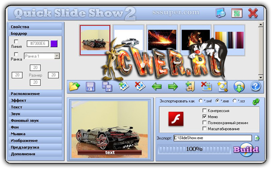 Quick Slide Show - программа является незаменимым инструментом для web-разработчиков при создании flash-роликов, менеджеров по продажам при создании презентаций товаров или услуг, учителей и педагогов при подготовке интерактивных учебных материалов для уроков и лекций.