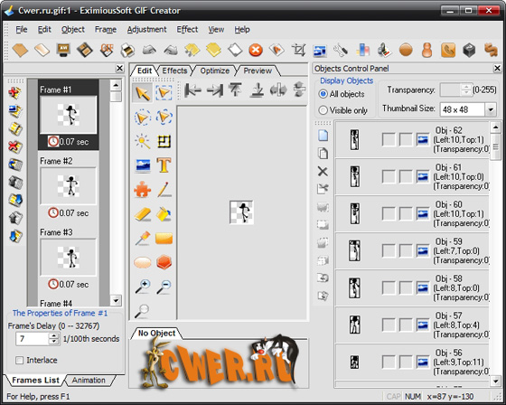 EximiousSoft GIF Creator - мощная, надежная и простая в использовании программа для создания анимированных GIF изображений, включая баннеры и аватары. Несмотря на небольшой размер, программа имеет многочисленные инструменты, позволяющие не только создавать новое изображение непосредственно в окне редактора, но и использовать для этого готовые видеофайлы и секвенцию графических файлов. Эта программа поддерживает множество форматов, включая GIF, AVI, BMP, PCX, JPG, TIFF, PNG, TGA, PSD, ICO, CUR, ANI, SWF и другие. Программа позволяет пользователю работать со слоями изображений, а также накладывать эффекты на выбранные изображения, а также изменять яркость, контраст и насыщенность картинки. Кроме того, с помощью этого инструмента вы сможете максимально оптимизировать качество изображения для уменьшения размера готового файла анимации. Интерфейс программы удобен и прост в использовании.