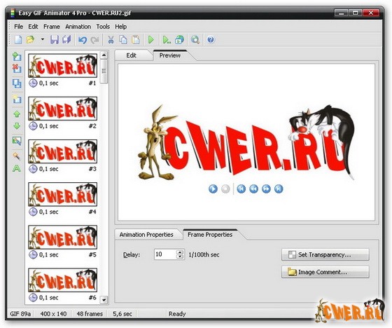 Easy Gif Animator - программка для создания gif-анимации (кнопки, банеры и т.д.), с ее специальными возможностями вы можете добавить ошеломляющие визуальные эффекты к своим мультипликациям, подготовить их к вашей web-странице и сделать многое другое. Easy Gif Animator может обработать любой тип GIF анимации, обеспечивает высокую степень сжатия и отличное качество ваших анимированных GIF-изображений.
