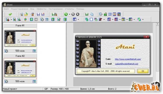 Atani - быстрое и эффективное создание анимированных GIF и AVI по принципу всё в одном. Встроен редактор кадров. Имеется возможность масштабировать изображение, настраивать все параметры кадра, оптимизировать цветовую палитру, регулировать прозрачность, добавлять бегущую строку, а также захватывать экранную анимацию и сохранять отдельные кадры из AVI. Поддерживаются форматы BMP, JPG, GIF, PNG, ICO... Интерфейс многоязычный, в том числе русский.