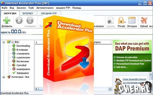 Download Accelerator Plus — Менеджер загрузок, т.е. программа, упрощающая и ускоряющая процесс скачки файлов из Интернета. Выбранный для закачки файл "режется" на части, которые DAP начинает загружать одновременно — в несколько потоков, за счет чего общее время загрузки файла уменьшается, причем это ускорение может быть довольно значительным.