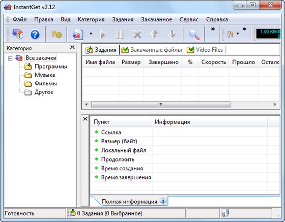 InstantGet — это небольшой, но мощный и удобный менеджер загрузок, позволяющий скачивать файлы по протоколам HTTP и FTP. Программа обладает приятным и удобным интерфейсом, поддерживает докачку, может скачать файлы несколькими потоками, позволяет ускорить загрузку, обладает большим количеством настроек, имеется встроенный поиск, интегрируется в оболочку, отслеживает появление ссылок в буфере обмена, автоматическая сортировка загруженных файлов согласно их расширениям, поддерживает функцию drag and drop, умеет работать через прокси и многое другое.