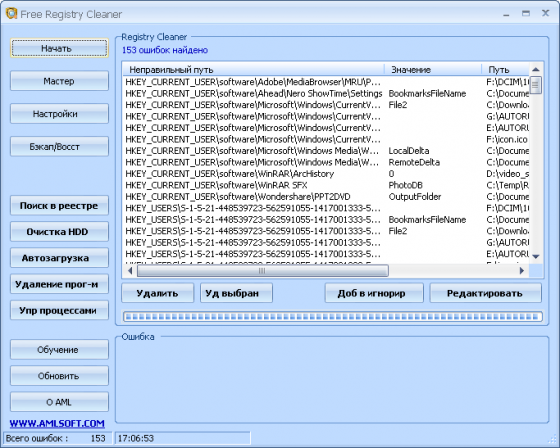 AML Free Registry Cleaner 4.13 - утилита для удаления ненужных файлов, очистки системного реестра, а также управления процессами, автозагрузкой и деинсталляцией программ. Благодаря детальному менеджеру Вы можете видеть все программы, которые загружаются при автозапуске и опционально отключить их. AML Free Registry Cleaner также находит и удаляет общие захламляющие файлы, которые накапливаются со временем. Он имеет 22 типа файловых расширений, и Вы можете расширить ряд, добавляя ваши собственные типы файлов. AML Free Registry Cleaner также обеспечивает детальный краткий обзор запуска программ и процессов.
