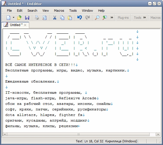 Emurasoft EmEditor Professional - мощный SDI текстовый редактор для программистов, веб-разработчиков и простых пользователей с подсветой синтаксиса и поддержкой юникода. Среди ключевых функций этого текстового редактора поиск и замена в файлах с использованием регулярных выражений, поддержка плагинов, подсветка ссылок и адресов электронной почты, блочный режим выделения, настройка панели кнопок, меню, шрифта, цвета элементов. Для каждого языка можно создавать отдельную конфигурацию. EmEditor имеет поддержку мощных макросов написанных на JavaScript или VBScript, позволяющих создавать практически любые действия, используемые часто или периодически. Макросы базируются на Windows Scripting Host (WSH) engine.