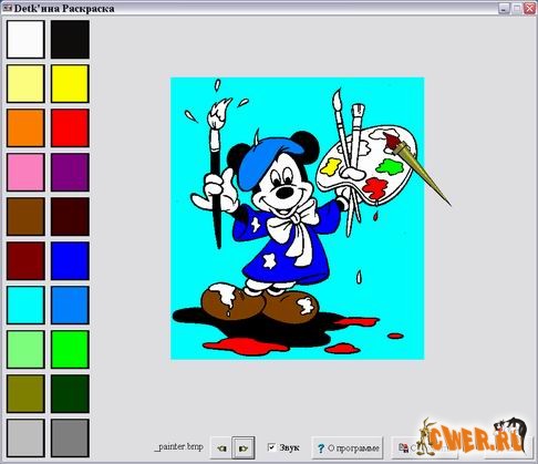 Эта программа- одна из версий электронных раскрасок, дополненная (в целях развития и обучения, ессна J) звуком, и (для разнообразия) расширяемым набором раскрасок.