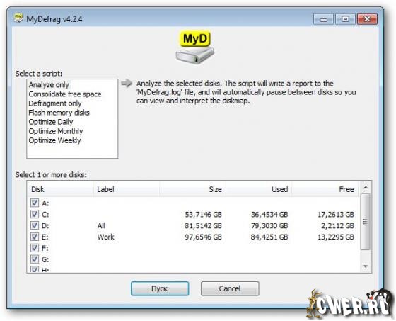 MyDefrag - представляет собой дисковый дефрагментатор и оптимизатор для Windows 2000, 2003, XP, Vista, 2008, а также Win7. Быстрый и нетребовательный к ресурсам, MyDefrag использует MS API, обладает несколькими стратегиями оптимизации и может дефрагментировать флоппи- и USB-диски, карты флэш-памяти и вообще все устройства, распознаваемые системой как диск.