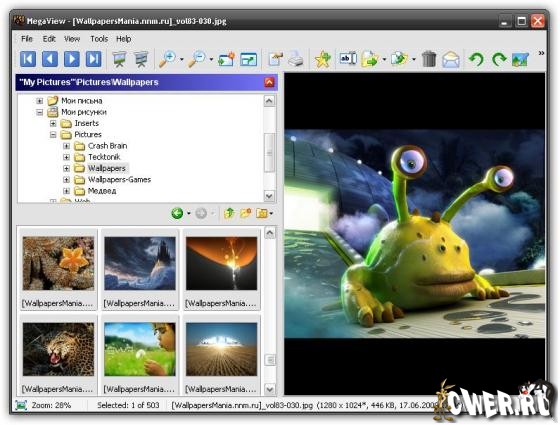 MegaView - универсальный вьювер (просмотрщик) графических и мультимедиа файлов, - фото, видео, аудио, web и документов. Поддерживает более ста различных мультимедийных файло, текстовых, web, MS Office документов. Программа умеет производить пакетное конвертирование файлов из одного формата в другой, а так же редактировать графические файлы с помощью встроенного редактора.