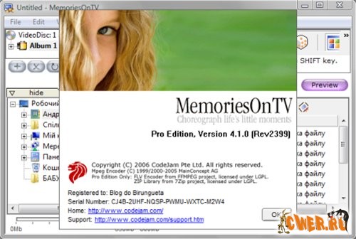 Обновленная версия MemoriesOnTV Pro 4.0 + Clipshow Package Volume + Ваши фотографии (формат любой, кроме PSD) и/или видеоклипы (mpg, avi, mov, mp4) - это всё, что нужно для создания/записи собственного качественного DVD, VCD или sVCD с потрясающими голливудскими переходными эффектами, музыкальным сопровождением и возможностью просмотра на стандартных DVD, VCD плеерах или на компьютере. Русификатор присутствует.