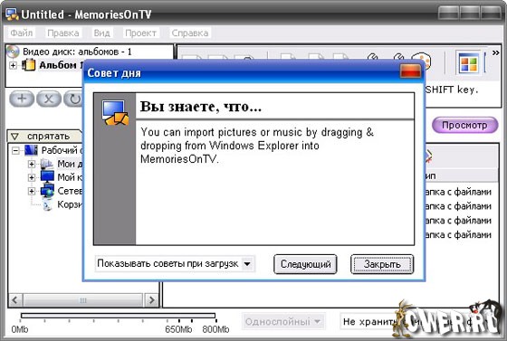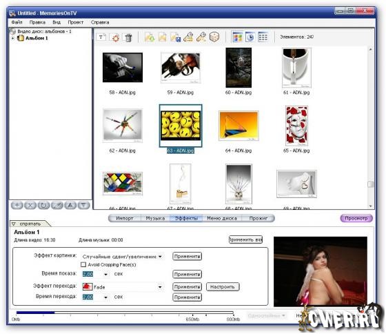 Обновленная версия MemoriesOnTV Pro Clipshow 1.1 Ваши фотографии (формат любой кроме PSD) и/или видеоклипы (mpg, avi, mov, mp4) - это всё, что нужно для создания/записи собственного качественного DVD, VCD или sVCD с потрясающими голливудскими переходными эффектами, музыкальным сопровождением и возможностью просмотра на стандартных DVD, VCD плеерах или на компьютере.