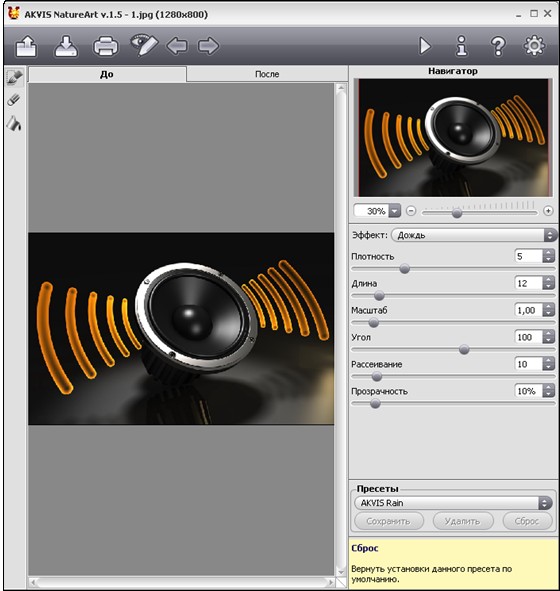 AKVIS NatureArt - собрание уникальных эффектов, которые имитируют различные природные явления. Программа даёт возможность добавить на фото дождь или снег, молнии, солнце и облака, водный массив или огонь, сотворить морской пейзаж или вид ночного звездного неба. Если изображение выглядит не достаточно интересным, при помощи NatureArt можно привнести в него динамизм, заставив природные стихии разбушеваться, или, наоборот, изменить настроение фотокартины, добавив в нее мирный свет солнца.