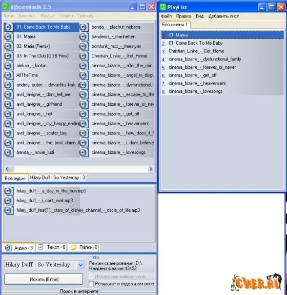 DjScanMusik 2.3 поисковая система аудио файлов,на локальном компьютере и сети интернет. Одновремено возможен поиск текстовых файлов и директорий.