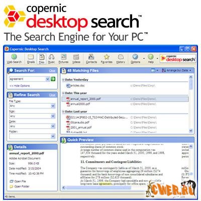 Поисковая система по жесткому диску (дискам)- мгновенно находит интересующие сведения в документах MS Office (Word, PowerPoint, Excel), архивах Outlook / Outlook Express, текстовых документах, HTML-страницах, Фаворитах и Истории IE, Mozilla Firefox, Mozilla Browser и Netscape 6.x/7.x, документах WordPerfect и Adobe Acrobat (*.pdf). Кроме этого, производит поиск по аудио, видео и графическим файлам, а также по контактам Outlook / Outlook Express и адресной книге Windows.