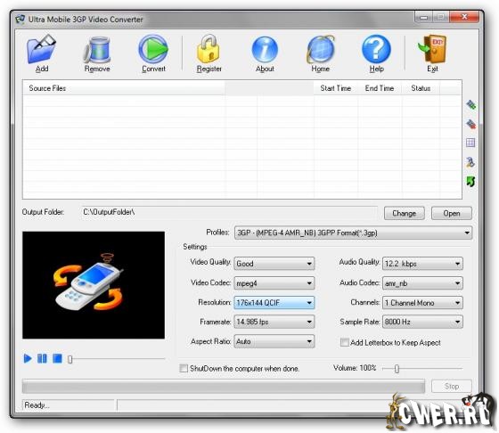 Ultra Mobile 3GP Video Converter - это мощный преобразователь 3GP. Позволяет вам конвертировать видео в формате DivX, XviD, AVI, WMV, MPEG, MP4, M4V, FLV, 3GP, ASF, RM, RMVB, MOV, ASX, MKV, OGM, SVCD, VCD, VOB в формат 3GP 3G2 H263 MP4, используемых в мобильных телефоннах и в других устройствах. Никакая другая программа не может преобразовать так много видео форматов. Выбор и настройка параметров конвертирования, нарезка и соединение отрезков с сохранением в выбранный формат, подключение кодеков, поддержка файлов с размером больше 2GB, высокая скорость и высокое качество, простой и удобный интерфейс.