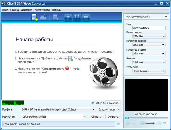 Xilisoft 3GP Video Converter - конвертер MPEG, VOB, AVI, DV, MOV, анимационный GIF, swf, MPEG4, RM, WMV, ASF, WAV, WMA, MP3, 3GP, m4a, mp4, h264, MP2, OGG, m4v в популярный и хорошо понимаемый смартфонами и мобильными телефонами формат - 3GP, и соотвественно в обратном направлении 3GP в MPEG, AVI, VOB, MPEG4, WMV. Программа позволяет пакетный режим конвертирования, выбирать и настраивать аудио и видео кодеки, есть предварительный просмотр во встроенном проигрывателе.