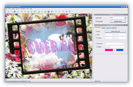 Greeting Card Studio - легкая в использовании программа для быстрого создания высококачественных поздравительных открыток. С помощью этой программы вы сможете создавать открытки, используя ваши собственные изображения, фон и текст. Программа содержит в себе готовые профессиональные шаблоны, предназначенные для быстрого создания открытки. Вам нужно всего-лишь выбрать бумагу, нужный дизайн, открыть понравившийся шаблон, отредактировать открытку и распечатать ее на принтере. Также вы сможете создать собственный уникальный дизайн и наложить на картинки эффекты, рамки, границы, сделать фон и наложить различные изображения на вашу открытку. При этом, вам дается возможность масштабирования и переворачивания фотографий как вы пожелаете. Готовый результат вы сможете распечатать на принтере или сохранить в один из графических форматов.