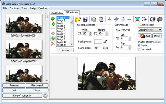 AVD Video Processor - является легким в использовании инструментом для захвата кадров из видео файлов и создания профессионально выглядящих GIF анимаций. Приложение, работает практически со всеми популярными видео и графическими форматами, доступные в настоящее время, включая AVI, MPEG, MPG, DivX, а также FAX, TIFF, GIF, JPEG, PNG, BMP, PCX, PDF, PS, WBMP , DIB, RLE, TGA, PBM, PGM и PPM, PDF, PostScript (PS, EPS), Adobe Photoshop PSD. Что позволяет обрабатывать видео без необходимости конвертировать его в подходящий формат во внешних приложениях.