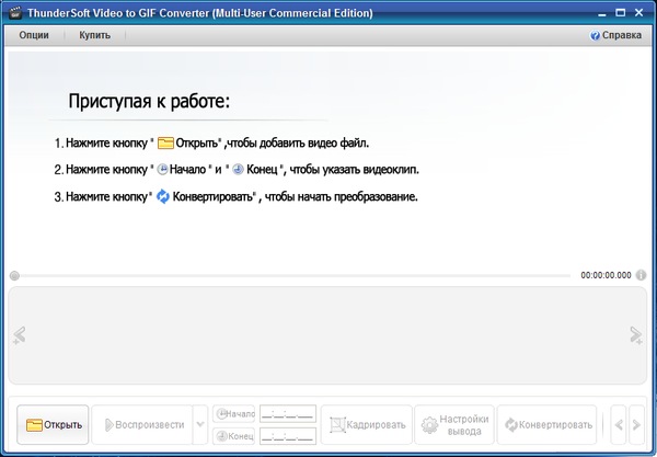 ThunderSoft Video to GIF Converter – удобный инструмент для создания анимированных gif-файлов из видео. Предварительный просмотр видео кадр за кадром, простая обрезка и создание небольших видео-клипов, а также конвертация в gif в высоком качестве позволят создавать отличные клипы. Программа позволяет настраивать скорость воспроизведения gif, количество повторных воспроизведений, а также изменение размера. Также поддерживается возможность установить различные форматы такие как: mp4, avi, mpg, wmv, flv, mov, vob, mkv, rmvb и т.д.