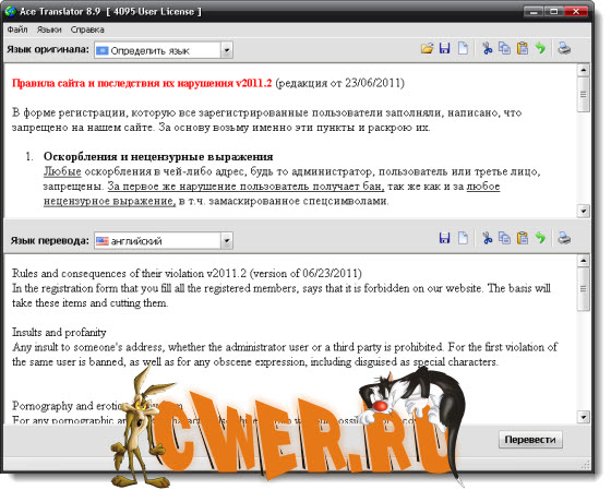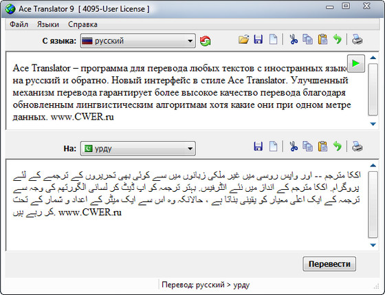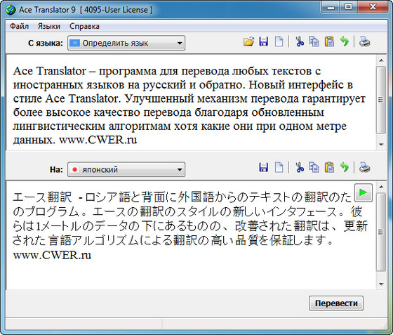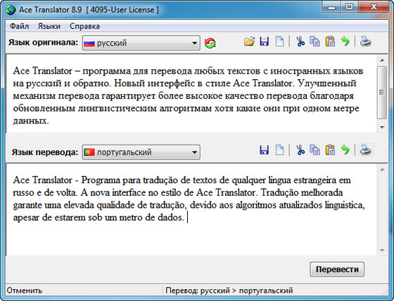 Ace Translator – программа для перевода любых текстов с иностранных языков на русский и обратно. Новый интерфейс в стиле Ace Translator. Улучшенный механизм перевода гарантирует более высокое качество перевода благодаря обновленным лингвистическим алгоритмам хотя какие они при одном метре данных.