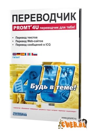 Будь в теме! Быстрый и точный перевод всегда «под рукой»! Самый "легкий" переводчик в линейке продуктов РROМТ 8.0, гордости российского софта -РROМТ 8 4U Giаnt! Легко и просто переведет текст, сайт в Интернете или переписку в ICQ. Направления перевода: Английский-Русский, Русский-Английский; Немецкий-Русский, Русский-Немецкий; Французский-Русский, Русский-Французский; Испанский-Русский, Русский-Испанский; Итальянский-Русский. Ключевые преимущества: