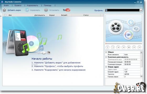 Вы сможете конвертировать аудио между MP3, WMA, WAV, AAC и OGG также как видео файлы, включая AVI, MPEG, MP4, WMV, ASF и т.д. в популярные аудио файлы, например: конвертирование MP4 в MP3. Дружественный пользовательский интерфейс Any Audio Converter позволяет вам добавлять и конвертировать любые незащищенные аудио и видео в MP3, WMA, AAC и OGG. Большинство работы выполняется автоматически, вам нужно сделать всего лишь несколько щелчков мышью.