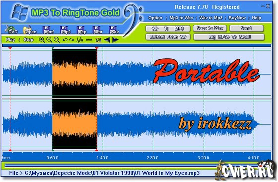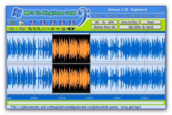 MP3 To Ringtone Gold – старшая версия линейки программ предназначенных для конвертирования музыкальных файлов и создания рингтонов для мобильных телефонов. Загруженный mp3, wma, wav, oggили amr файл будет представлен в виде удобной двухканальной диаграммы, под которой располагается временная линейка. Такой подход хорош тем, что позволяет без труда отыскать нужный фрагмент произведения, если пользователю не требуется конвертировать файл полностью.