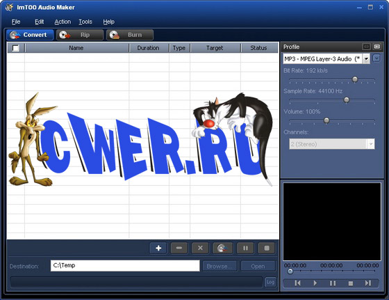 ImTOO Audio Maker - программа из разряда все в одном - это и аудио конвертер, граббер аудио CD, прожиг аудио CD. Особенностью данной программы является поддержка MPEG, WMV, ASF, AVI, MOV, MP3, 3GP, RM, MP2, MP3, WMA, WAV, AU, M4A, RA, OGG, AAC, AC3, MPG, DAT, VOB, QT и других аудио форматов. Конвертор между форматами, производит пакетный режим конвертирования, извлекает аудио из видео файлов, аудио из аудио CD, создает и прожигает аудио CD, создает и редактирует ID3 (ID3V1, ID3V2) тэги, высокая скорость и качество, приятный и простой интерфейс.