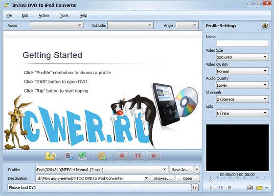 ImTOO DVD to iPod - поможет вам перевести DVD в iPod видео формат MP4 и в аудио форматы MP3, AAC, M4A, при этом конечный продукт будет иметь отличное качество. С помощью данной программы вы сразу сможете перевести DVD фильмы в iPod. По сравнению с другими программами данного типа, программа ImTOO DVD to iPod имеет больше функций, к примеру, она позволит вам перевести DVD в iPod, при этом изменив размер файла, также программа может перевести определенный сегмент DVD в iPod MP4 видео.