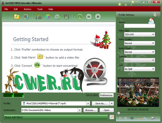 ImTOO MPEG Encoder - мощная утилита для конвертирования видео-файлов. Позволяет конвертировать файлы любых форматов, таких как AVI, MPEG, DivX, WMV, MP4, MOV, FLV, 3GP, PSP MPEG-4, iPod MPEG-4 и т.д. Помимо этого программа может извлекать аудиодорожку из видео-файлов, конвертировать большинство популярных звуковых форматов, таких как MP3, WMA, WAV, AAC, M4A и т.д. С помощью ImTOO MPEG Encoder можно быстро и с высоким качеством конвертировать любой файл в мобильные форматы 3GP, FLV, PSP, Zune, iPod, iPhone, Apple TV для дальнейшего использования в портативных устройствах. Имеется два режима работы программы: расширенны и пошаговый, с помощником. Начинающему пользователю легче работать в пошаговом режиме, а опытному пользователю предоставляется возможность использовать множество настроек для конвертирования видео в расширенном режиме.