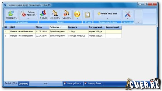 Birthday - программа для напоминания важных для пользователя дат и событий (дни рождения, юбилеи, праздники, памятные даты и прочее.) Программа имеет приятный интерфейс, довольно проста в использовании, позволяет пользователю добавить неограниченное число записей, а всю базу данных можно сохранить в отдельном файле в виде таблицы и распечатать.