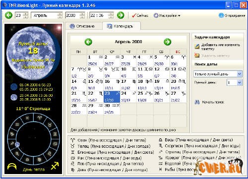 Симпатичный и функциональный лунный календарь. Рассчитывает лунный день, Луну в зодиаке, фазу Луны, качество дня, новолуние, полнолуние на 100 лет назад и вперед.