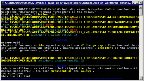 Faind Personal - утилита для поиска текста (полнотекстовый поиск), работающая в командной строке MS Windows, со встроенным индексатором/каталогизатором. Утилита обрабатывает вложенные каталоги, на лету распаковывает архивы популярных форматов (ZIP, RAR, ARJ, GZIP, BZIP2, TAR, 7ZIP, другие)...