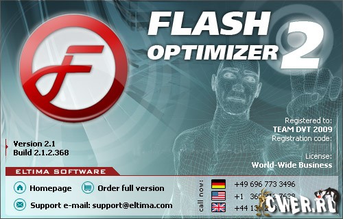 Eltima Flash Optimizer – лучшее программное решение для, веб-дизайнеров, веб-мастеров, Flash-профессионалов и всех кто когда-либо сталкивался с технологией Adobe Flash. Он позволяет уменьшить размер SWF файла на 60-70% благодаря алгоритмам векторов, образов, морфинга, Z-буфера, шрифтов и другой оптимизации. Flash Optimizer уменьшает размер не только какой-либо отдельной части Вашего Flash видеоролика, но и оптимизирует все его элементы (включая кривые, нулевые объекты, ZLib оптимизацию и др.).