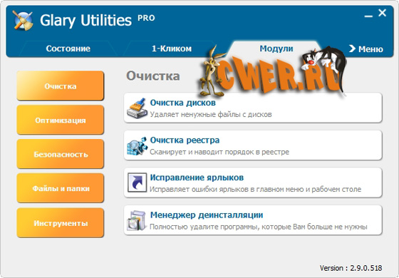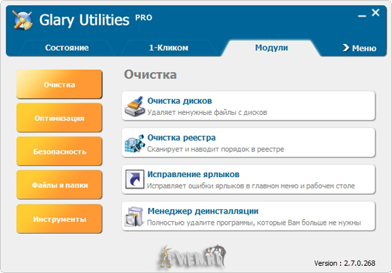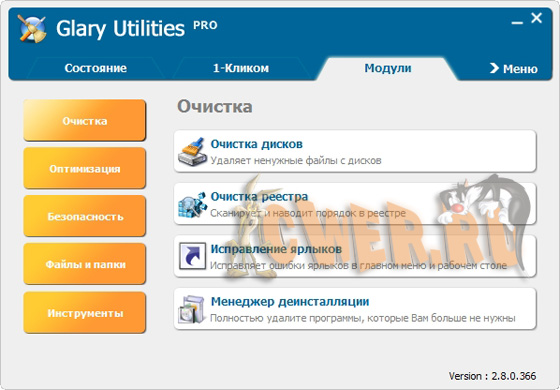 Функциональный набор системных твикеров и утилит для тонкой настройки, повышения общего уровня производительности и защиты ПК. Данное приложение позволяет пользователю избавиться от ненужных файлов, от устаревших регистрационных записей и истории Интернет-активности. При помощи Glary Utilities пользователь также может управлять (в том числе и удалять) различными модулями, используемыми для расширения функциональных возможностей браузера, производить анализ эффективности использования дискового пространства и поиск существующих копий определенных файлов.