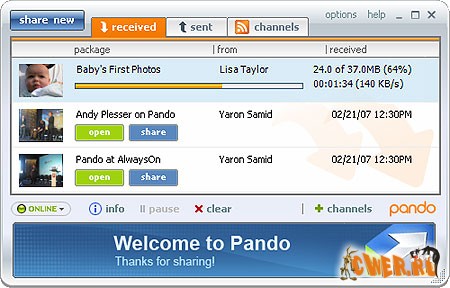 Инструмент безопасного обмена данными, предназначенный для использования как индивидами, так и крупными компаниями. По задумке разработчиков, новый программный продукт решит ряд проблем, связанных с пересылкой больших файлов в глобальной сети по электронной почте. Пользователи Pando смогут обмениваться файлами размером до 1GB. Pando - это программа, позволяющая пересылать и получать файлы и директории любого размера в Ваш почтовый ящик. На самом деле, в почтовый ящик попадает тщательно зашифрованный маленький файл с расширением *.pando, где и находится информация о местонахождении нужного Вам файла. Причем понять, где же собственно находится искомый файл, совершенно невозможно. Да и сам пересылаемый файл тоже тщательно упаковывается-шифруется в процессе передачи в специальные пакеты-посылки.