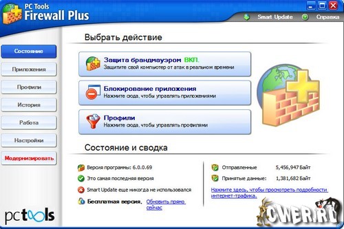 PC Tools Firewall Plus 6.0.0.69 - новая версия одного из лучших Фаерволов, для защиты компьютера от несанкционированного доступа в интернет, хакерских программ, троянов, backdoor-ов, кейлоггеров и другого опасного ПО. PC Tools Firewall Plus 6.0.0.69 подходит как новичкам, так и более продвинутым юзерам в области компьютерной безопасности. В программе присутствует модуль слежения за сетевой активностью приложений, который блокирует или разрешает с согласия пользователя той или иной программе принимать и передавать данные в сеть.