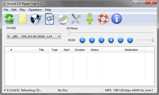 Accord CD Ripper - CD риппер, работающий с несколькими аудио форматами. Преобразовывает треки в wav и mp3 на довольно высокой скорости, которая еще увеличивается в многопроцессорных системах. Программа может искать информацию об альбомах как в локальных, так и в удаленных базах CDDB, эта информация затем может быть отредактирована. Запись мета-данных производится автоматически, есть встроенный CD плеер и многое, многое другое. Интерфейс программы предельно прост и дружественен.