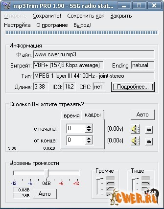 Это маленький, если не сказать крошечный, редактор для файлов формата MP3. Например, можно сделать плавное затухание звука в конце композиции, отрегулировать громкость трека, обрубить паузы в начале и в конце трека и т.д. Самое ценное, что для работы с MP3 программе не требуется перекодировать данные в формат WAV, как это делают многие серьезные редакторы. Соответственно, времени на обработку композиции затрачивается существенно меньше.