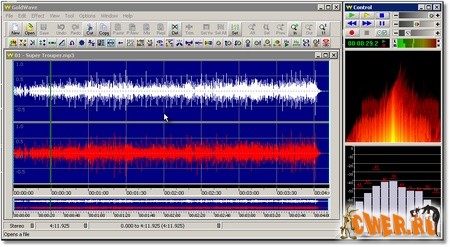 GoldWave - очень мощный звуковой редактор, предназначенный для проигрывания, редактирования, смешивания и анализа звуковых файлов. Умеет быстро работать с большими файлами. Имеет много разных эффектов. Понимает MP3, WAV, AU, IFF, VOC, SND, MAT, AIFF, raw, data, а также множество прочих форматов. Умеет конвертировать из одного формата в другой. С помощью GoldWave можно применять всевозможные эффекты (добавлять эхо, эффект "увядания" звука (Fade), редактировать эквалайзером и пр.) убирать шумы, реставрировать старые записи и т.д. GoldWave позволяет записывать звук с кассет, пластинок, радио, а также с микрофона. Инструмент CD Reader дает возможность делать точные копии треков аудиодисков.