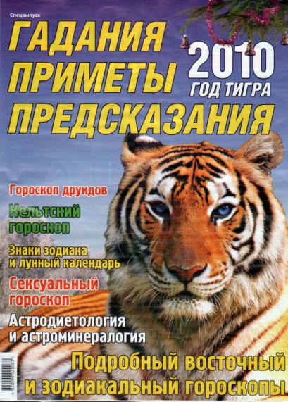 Специальный выпуск издания «Гадания. Приметы. Предсказания». В номере восточный гороскоп, совместимость знаков восточного гороскопа; кельтский, сексуальный и гороскоп друидов; астрологический прогноз для всех знаков на каждый день; а также о влиянии лунных дней на психику и здоровье человека, о лунных днях и красоте.