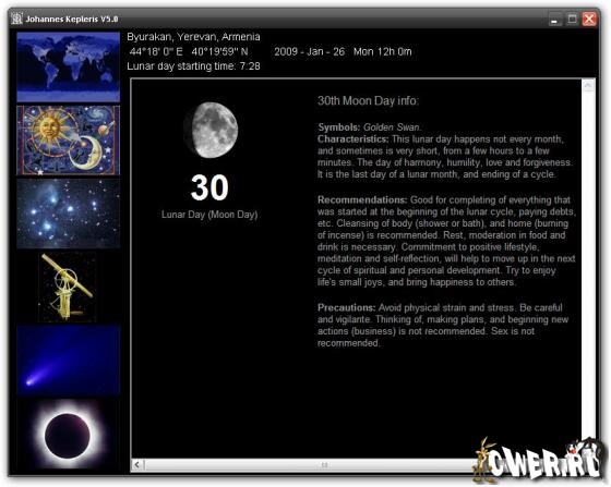 Эта программа является полнофункциональным календарем и вашим личным астрологом. Уникальная особенность программы - то, что в ней имеется два представления событий относительно календаря. Первое является стандартным, а второе основано на Зодиаке и делит календарь согласно знакам гороскопа.