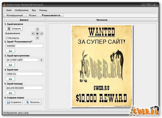 Poster Forge – генератор постеров в стиле “Разыскивается”, “Фильм“, “Мотивационный“. Легкий в использовании и абсолютно бесплатный.